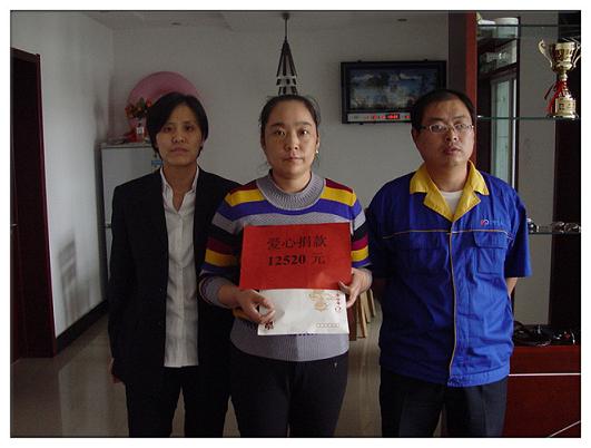 10月11日,黨支部書記殷翠紅、生產(chǎn)經(jīng)理甘寶傳、后勤主任羅峰一行代表公司領導及全體員工將這筆飽含關愛摯情的捐款交到了尹天真手上。尹天真收到捐款后,含淚表示:非常感謝領導同事對自己的幫助, 以后會更加認真、努力干好本職工作,以此回報大家的愛心。