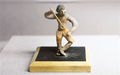 走進(jìn)展廳,首先看到的展品是戰(zhàn)國時期銅武士像,于1983年出土于伊犁哈薩克自治州新源縣鞏乃斯河南岸的墓葬中。武士上身直挺,頭戴希臘式武士盔,盔上高高凸起長盔纓,目光堅(jiān)毅嚴(yán)肅,下身半跪,雙拳緊握,原來應(yīng)握有器物,披甲帶器,像是正在接受命令安排,即將奔赴戰(zhàn)場。銅武士像旁邊是出土于同一地點(diǎn)的翼獸銅環(huán),環(huán)體中空,環(huán)圈前部有小亞細(xì)亞、西亞等地流行的高浮雕翼獸,可能為祭祀之用。配合著展廳左壁懸掛的新疆風(fēng)景圖畫,斑駁的青銅講述著它們于這片蒼茫天地間的過往,他們曾熟練地鑄造青銅,舉行盛大隆重的祭祀,武士們?yōu)椴柯涠鴳?zhàn),曾與希臘化世界有著深入的交往。