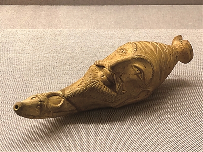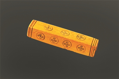 展品中的骨博具則與另一座城有關(guān)。骨博具是中原地區(qū)文化娛樂生活中常見的器具,類似今天的骰子。展出的這件骨博具出土于新疆卓爾庫特古城晚期地層魏晉十六國時期的房址中。以大型動物骨骼磨制而成,長方形,中空,兩端各刻三道橫槽,中間分別刻1至4個圓圈,每個圓圈中間有4個小圓,小圓中心帶孔,古樸精致。