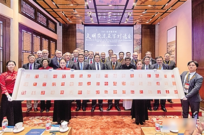 圖為閉幕式上,與會(huì)嘉賓展示書法版《文明交流互鑒對話會(huì)北京宣言》。藺紫鷗供圖