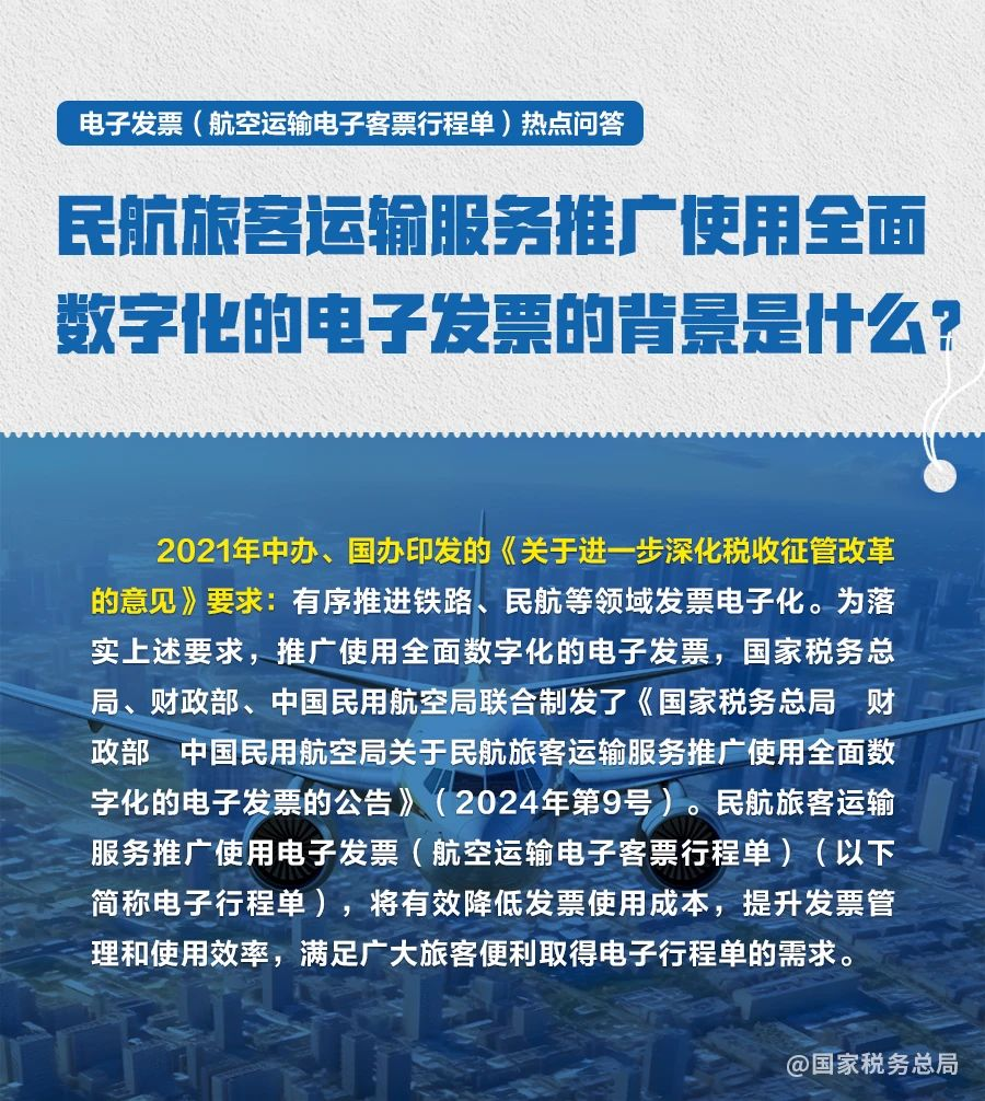 日前,國(guó)家稅務(wù)總局、財(cái)政部、中國(guó)民用航空局聯(lián)合發(fā)布《關(guān)于民航旅客運(yùn)輸服務(wù)推廣使用全面數(shù)字化的電子發(fā)票的公告》,明確自2024年12月1日起,在我國(guó)民航旅客運(yùn)輸服務(wù)領(lǐng)域推廣使用全面數(shù)字化的電子發(fā)票——電子發(fā)票(航空運(yùn)輸電子客票行程單)。相關(guān)熱點(diǎn)問(wèn)答如下: