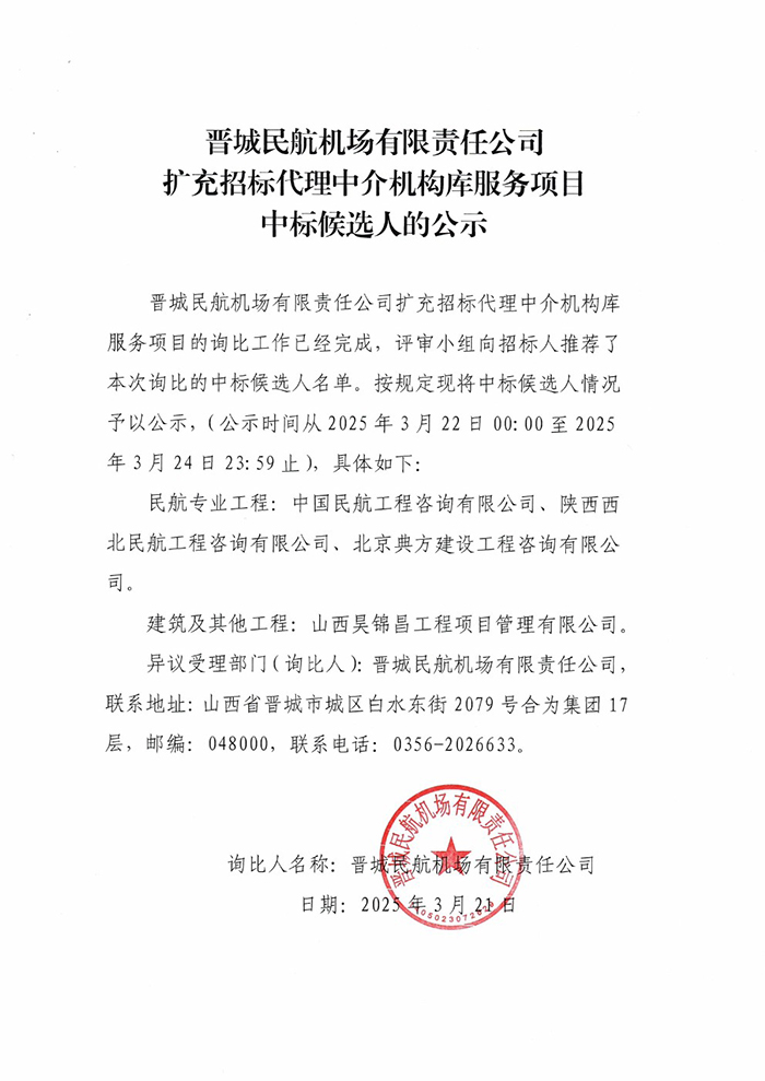 晉城民航機場有限責任公司擴充招標代理中介機構庫服務項目中標候選人的公示