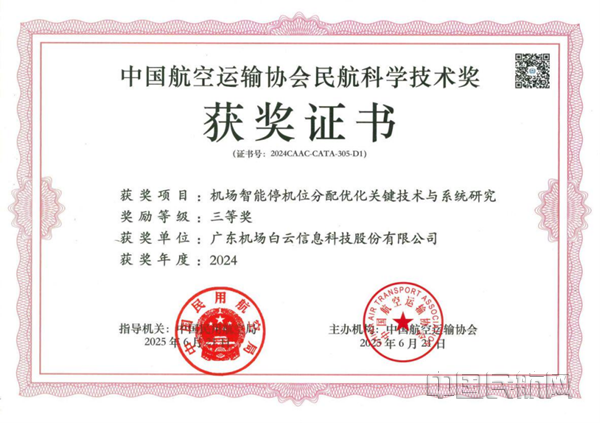 中國(guó)民航網(wǎng) 通訊員李慶泰、項(xiàng)嘉懿 報(bào)道:近日,廣東機(jī)場(chǎng)白云信息科技股份有限公司(以下簡(jiǎn)稱(chēng)“白云信科”)憑借“機(jī)場(chǎng)智能停機(jī)位分配優(yōu)化關(guān)鍵技術(shù)與系統(tǒng)研究”項(xiàng)目,榮獲2024年度中國(guó)航空運(yùn)輸協(xié)會(huì)民航科學(xué)技術(shù)獎(jiǎng)三等獎(jiǎng)。這一獎(jiǎng)項(xiàng)不僅是對(duì)白云信科技術(shù)創(chuàng)新能力的認(rèn)可,更標(biāo)志著白云機(jī)場(chǎng)運(yùn)行管理智能化水平邁上新臺(tái)階。