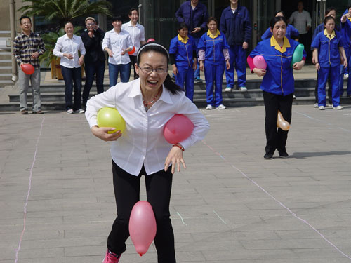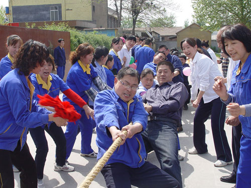 活動(dòng)方案公布后,全體員工踴躍參與,共分為五個(gè)參賽團(tuán)隊(duì),設(shè)六個(gè)比賽項(xiàng)目:拔河、吸乒乓球、三人四足、雙人背靠背運(yùn)氣球接力賽、企鵝漫步、跳繩。下午13:30比賽正式開始。首先進(jìn)行的是拔河比賽,隨著裁判哨子的吹響,參賽隊(duì)員突然發(fā)力,個(gè)個(gè)都漲得面紅耳赤,青筋爆粗,拼盡渾身力氣,不顧一切地往后拉。各啦啦隊(duì)熱情高漲,加油聲,吶喊聲此起彼伏,飄蕩在整個(gè)廠區(qū)。